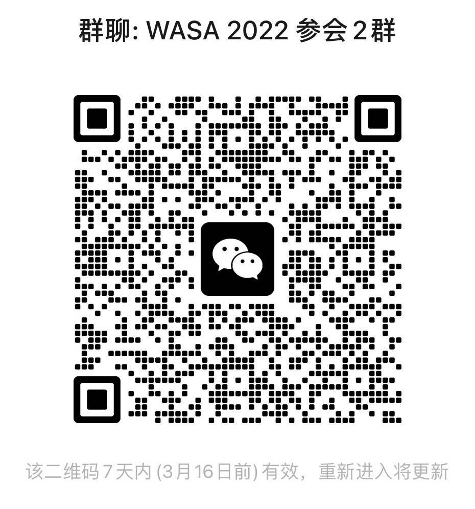 English version for the ones from other areas and countries) to 2022wasa@gmail.com with subject “Registrationform-paper ID” (your paper ID can be checked out from EasyChair). If you have any questions regarding registration, please feel free to contact us via 2022wasa@gmail.com.
